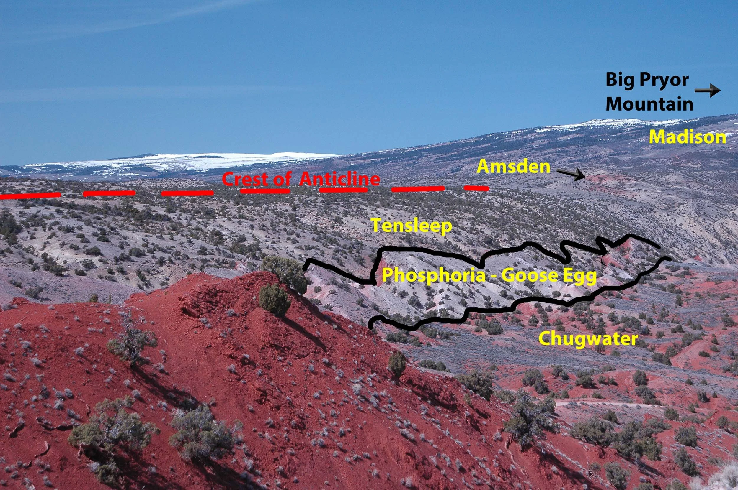 From the Vermillion Valley Viewpoint we can see the crest line of the plunging anticline. (Figure 6) The resistant Tensleep Sandstone drapes over the crest, dipping steeply eastward on the east side and dipping more gently westward on the west. The crest line plunges gently southward. The red patch farther to the north up Big Pryor Mountain in the center right is the underlying Amsden Formation. The Tensleep, originally above the Amsden, has eroded away exposing the Amsden. Higher (and farther north) still is the Madison Limestone originally deposited beneath the Amsden. There even the Amsden is eroded off the anticline. Because the anticline plunges to the south, or rises to the north, we see older layers exposed farther north.