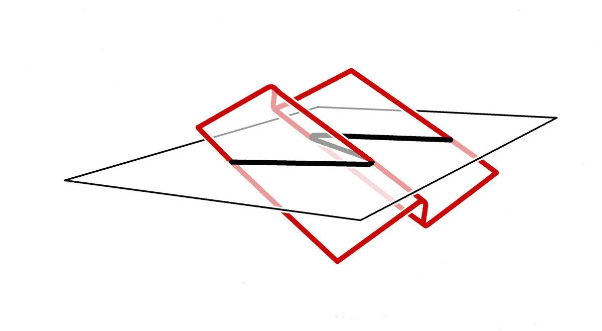 Figure 7: Red lines represent one layer in a plunging anticline-syncline fold. Black indicates a horizontal erosional surface. Note thick black zigzag where folded layer intersects horizontal plane.