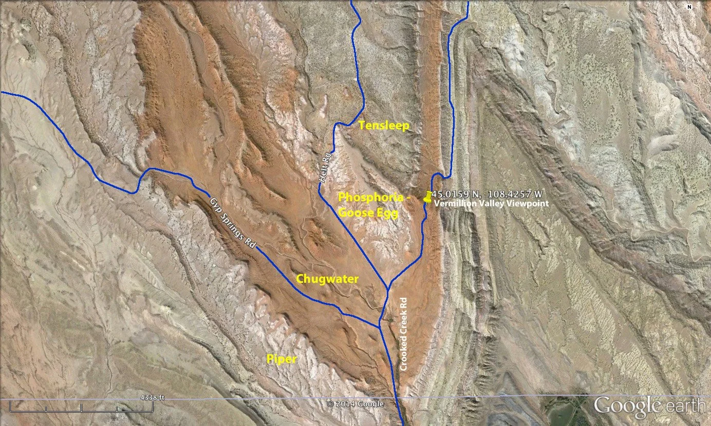 There is interesting additional information in the following charts. Look for the formations mentioned above. These charts are part of a report by the National Park Service for the Bighorn Canyon National Recreation Area - just 8 miles east of Vermillion Valley.